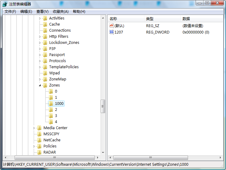 选择“HKEY_CURRENT_USER\Software\Microsoft\Windows\CurrentVersion\Internet Settings\Zones“