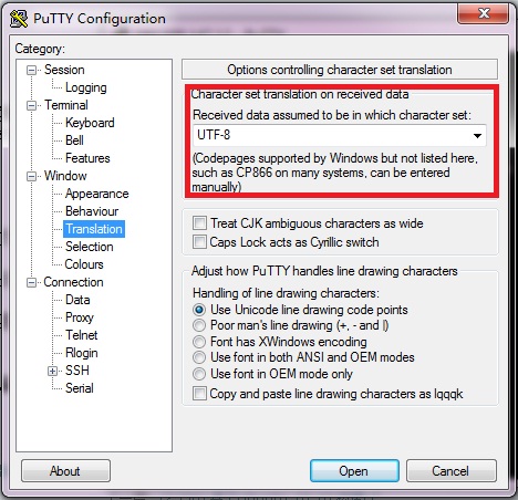 好了,最后在PuTTY中将字符编码设置为UTF8,这样PuTTY就能正确解码UTF8编码的中文字符了。